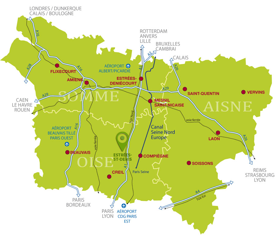 Estrées-Saint-Denis est idéalement située à 5 km de la sortie 10 de l'autoroute A1, traversée par la D1017 qui va de Paris au nord de la France et à 2 km de la N31 qui relie Compiègne à Beauvais.